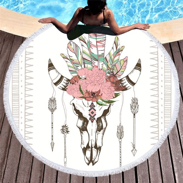 Acheter 1 Pièce Tête De Taureau Crâne Ronde Serviette De Plage Plumes Gland Floral Tapisserie Illustration De Tapis De Yoga Squelette Toalla