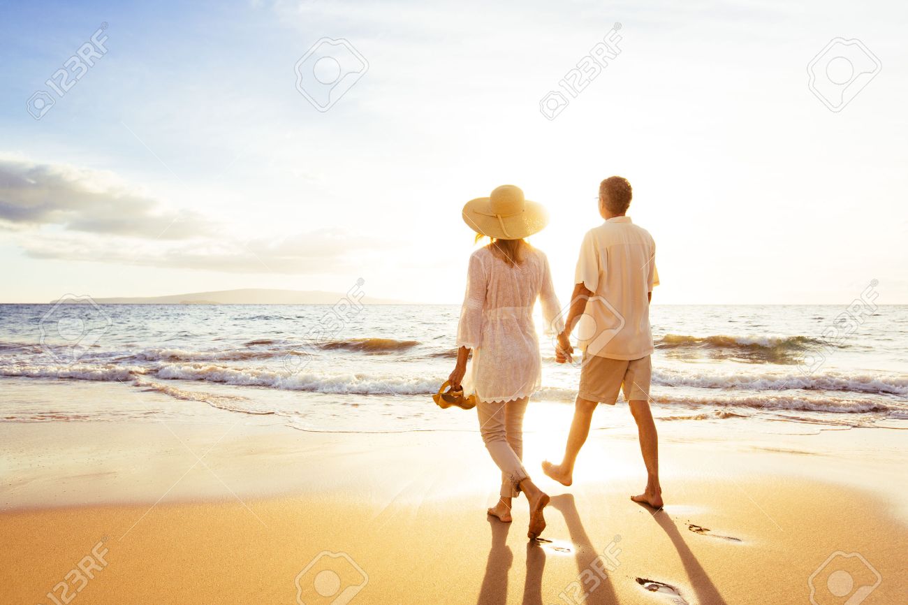 Heureux Couple Dâge Romantique Moyen Bénéficiant Beautiful Sunset Promenade Sur La Plage Voyage Vacances Retraite Concept Mode De Vie